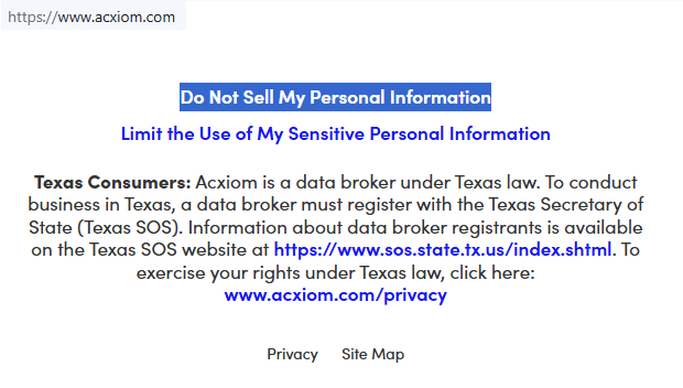 Open acxiom.com in a private browser window. Scroll to the footer of the site and look for the “Do Not Sell My Personal Information” link.