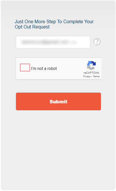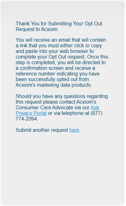 At this step, confirm that the contact details shown match what you submitted earlier. If anything is wrong, back out and start a new request. When everything looks accurate, confirm the choice. This confirms that you want to remove yourself from Acxiom.