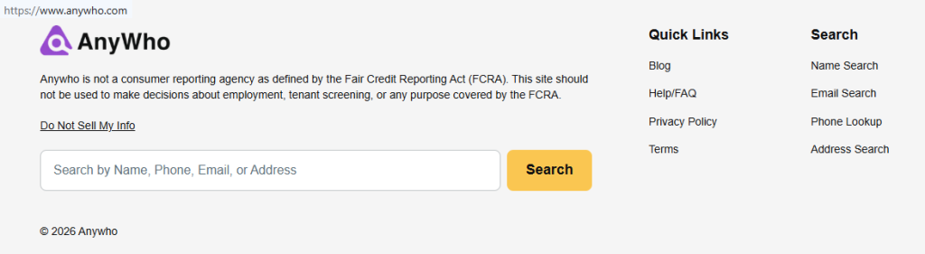 Go to the AnyWho homepage and scroll to the footer, where the privacy route appears near the site terms. Select the privacy rights path and follow the redirect toward the public data tools or suppression flow (it leads to Spokeo). Tip: Keep both tabs open so you can return to your search results without starting over.