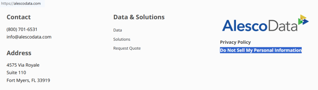 Go to alescodata.com, scroll to the footer, and click “Do Not Sell My Personal Information.” You may be redirected to a service that handles data on behalf of Alesco Data. If you started from a service through a marketing email or a website link, confirm the message clearly refers to this company. Keep screenshots for your records, but blur sensitive details.