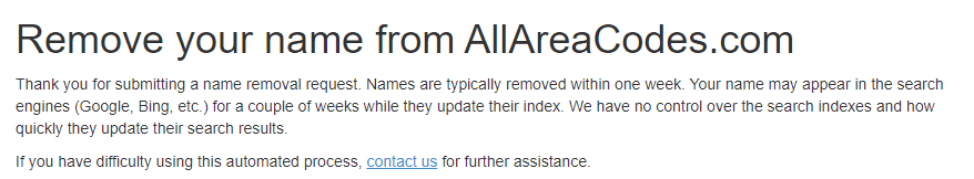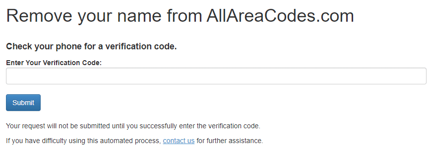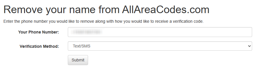 Go to the official AllAreaCodes site and open the “Remove Name” page, which functions as the main opt-out form. Then enter your phone once, choose how to receive a verification code, and submit a single opt-out request. If a listing exists, information should be removed within several business days, depending on caching and partner feeds.