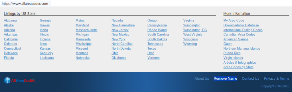 First, go to the AllAreaCodes site and scroll to the footer. Click the “Remove Name” or similar privacy link to reach the page that functions as the official opt-out form for this directory. Check the URL so you know you are on the correct domain. Take note of the fields and buttons you see, since these steps outlined will be the same if you return later.