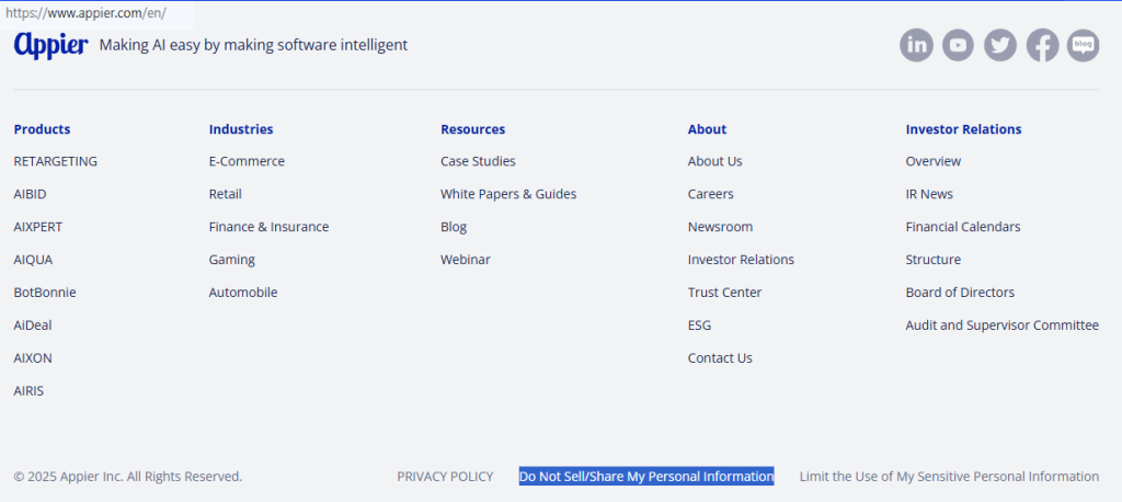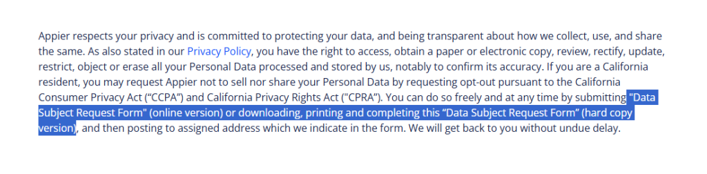 Visit the Do Not Sell/Share My Personal Information page, open the Data Subject Request Form, and submit your identifiers. The platform will make reasonable efforts to process and follow the request pursuant to the California Consumer Privacy Act. You can request Appier not to sell or share your personal data, and they’ll get back to you without undue delay.