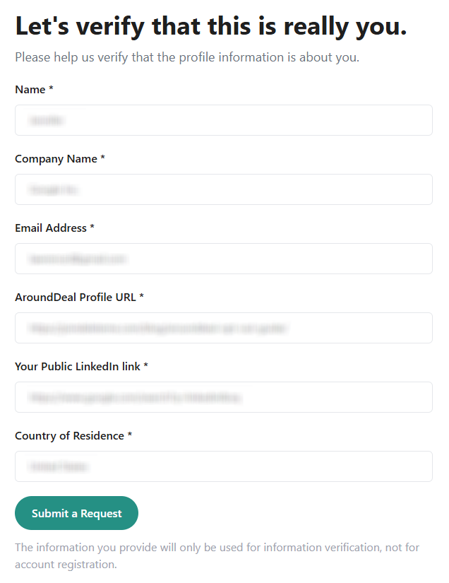 Enter your name, company, primary email address, AroundDeal account link, LinkedIn profile link, and country. If you’d rather not utilize your main inbox, we recommend using disposable emails or a burner you can access for verification. Tip: Verify fields before entering the requested information and consider using email lookup on your listing to confirm accuracy.