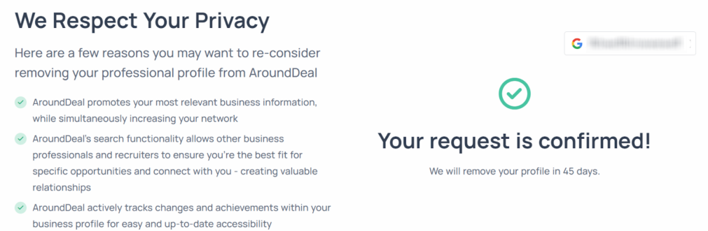 Select the final Submit/Confirm action to complete your opt-out request or opt out of arounddeal.com. The service maintains suppression lists so profiles aren’t shown to sales and marketing prospects. Sources mention 110 million business profiles and 100 million emails. Tip: If you need to cancel an account, use account settings separately.
