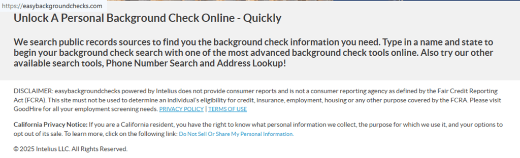 Go to the easybackgroundchecks.com homepage and scroll to the footer. Select “Do Not Sell Or Share My Personal Information,” then choose the rights/suppression choice that leads to the form for opting out of easybackgroundchecks.com. Save a screenshot for your files, but blur personal information before storing or sharing it. Tip: If the page won’t load, try another browser or turn off ad blockers.