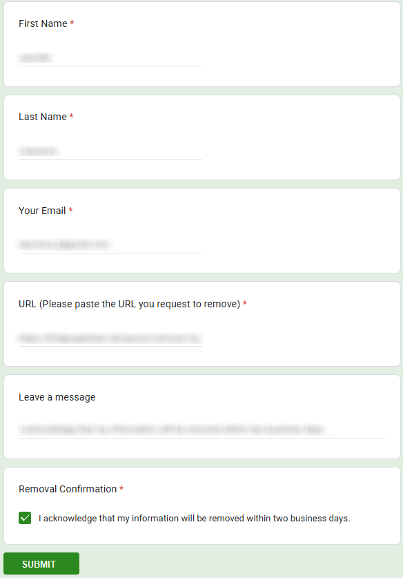 Use the site’s request page, open the matching record, and submit the online form with the record link and basic identifiers, then confirm using a verification email link or code. Typical processing is 2–7 days, and some entries are removed within 72 hours.