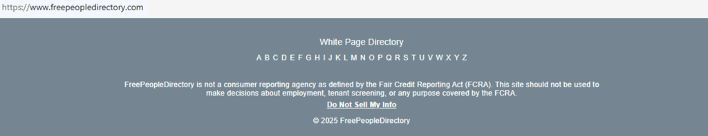 Open the website. Next, go to freepeopledirectory.com and select the footer link. Before you save any screenshot, cover sensitive fields. You do not need to sign in.