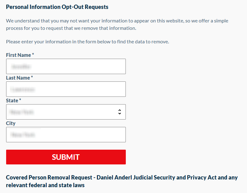 Use the footer links (“Do Not Sell/Share”) on the website, then select a button like “Submit Request.” If the form isn’t available, use the contact link shown there and paste the listing URL. Redact personal information in screenshots. Tip: Ensure pop-up blockers are off.