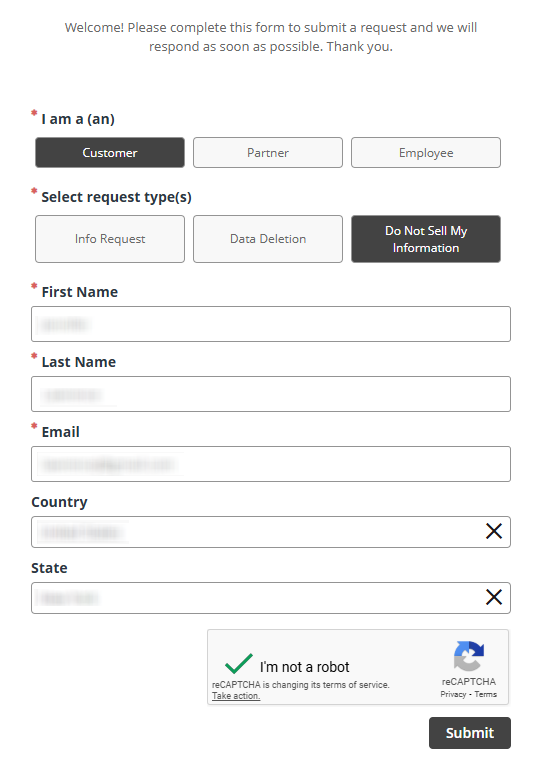 Choose your relationship and request type. Enter your name, email, and request details, then complete the CAPTCHA. Provide only the minimum needed. Before saving any screenshot for your records, blur sensitive data. When ready, click the submit button once and wait for the on-page notice. Keep the window open in case a follow-up prompt displays.