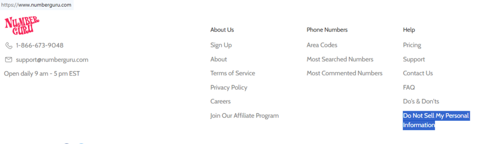 Go to NumberGuru and scroll to the bottom of the page for the “Do Not Sell” link, then click it. If you are redirected to BeenVerified, continue; it manages opt-out requests for NumberGuru. Choose ‘Do Not Sell My Info’ and continue. Blur personal data before saving screenshots.