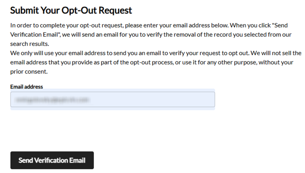 After you send it, check your inbox for the message. Open the email and click the ‘Verify Opt-Out’ button to verify and confirm your opt-out request; it may come from [email protected].