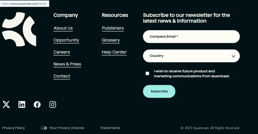 Quantcast provides digital advertising measurement and audience tools for publishers and marketers. The Quantcast platform and related products and services use tags on websites and mobile apps, plus partner data, to collect and use pseudonymous signals in connection with the services and deliver aggregated audience insights while following its privacy policy.