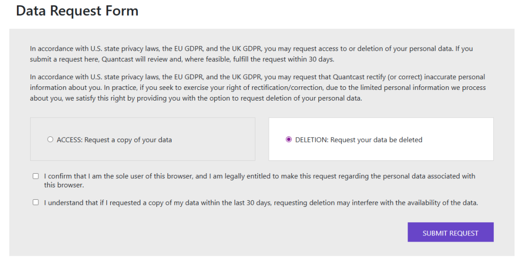 On the form, select the option to delete your personal information rather than just receive a copy. This option to request deletion tells Quantcast to process your personal information for erasure where possible. Enter the requested details so Quantcast can locate personal information we collect in relation to your profile. Complete the CAPTCHA, check the fields, and confirm that you want information about your online record removed.