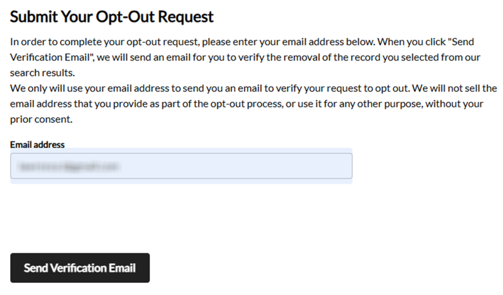 Open the verification email. Use the link to verify the action and confirm the opt-out. Tip: If nothing arrives, wait a few minutes and try one resend.