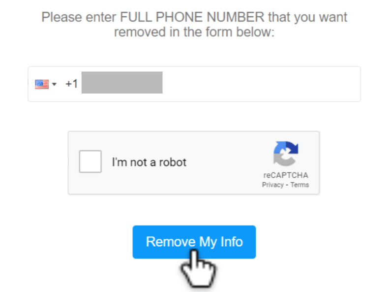 In the form, enter the phone number you want to remove. Complete the CAPTCHA to prove you’re a real user. Double-check the digits before you click the Remove My Info button to avoid errors. Tip: Blur or redact your personal information before saving any screenshots, and do not include any physical documents or IDs.
