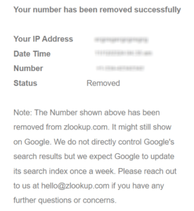 Zlookup typically processes queries fast. Re-check your listing after 24–72 hours. If it still appears, send the form again once. Keep your confirmation email and note the date to help if you need support later. Tip: If you have multiple numbers, gather them in a simple spreadsheet to track status and reduce unwanted exposure over time.