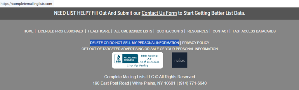 CompleteMailingLists is a consumer data provider. Its policy describes collecting data you submit and acquiring it from public sources and third parties, then using it to verify, update, and maintain its database for marketers and partners, and to share certain categories with them.