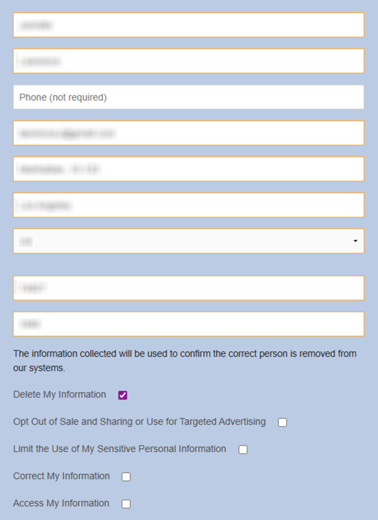 Select what you want to do: delete your record, opt out of sale/sharing, limit sensitive use, correct data, or Access data. Tip: Save a redacted screenshot that shows only the option you selected and the page title, not the fields you typed.