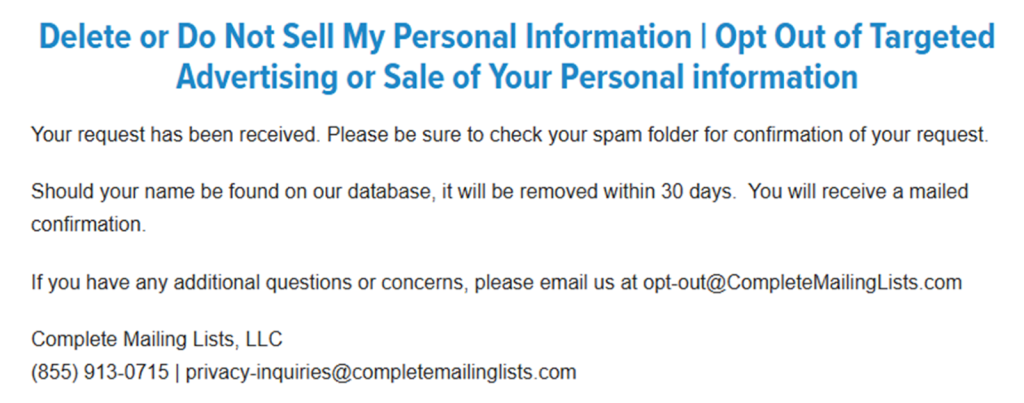 If your details are in CompleteMailingLists records, they can affect your privacy by exposing your name, address, and email. The Privacy Policy says the company collects personal information you provide and can also obtain it from public sources and other companies for marketing purposes. Then, it uses the data for marketing-related services and database upkeep.