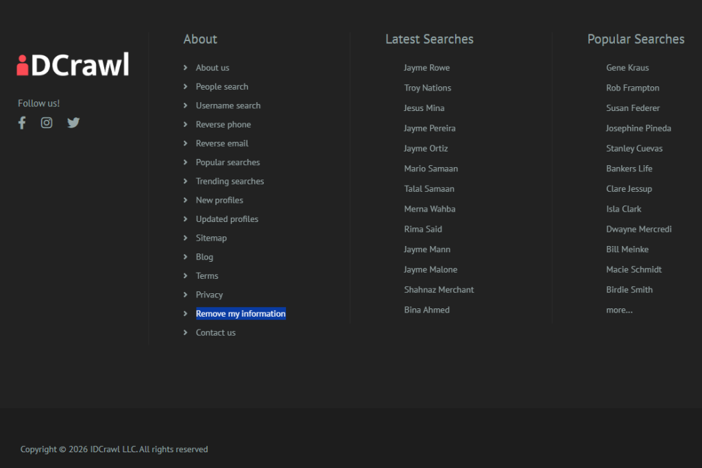IDCrawl is a free people-search service that collects public info into one profile. It may display contact details, address history, social pages, and other records. The site offers a form for a removal request and a privacy path for broader rights issues.