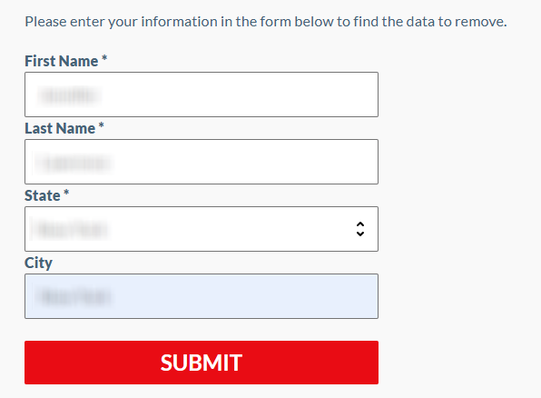 Open the privacy page area and navigate to the opt-out page. You’ll typically see a short form and a Submit button. If you take screenshots for reference, blur/redact private information (addresses, IDs, or anything you don’t want stored in an image). Tip: If the page stalls, refresh once or try a different browser session