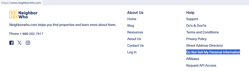 Go to the NeighborWho website. Look for the Do Not Sell My Information link in the footer. Open the official page used for an opt-out request, then review the instructions before you start. If you take screenshots, blur addresses, names, and other private information. A good tip is to use a private browser window so old search results do not stay cached.