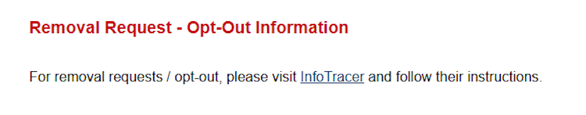 SearchUSAPeople may route the opt-out through InfoTracer. Open the InfoTracer privacy page in a new tab and read the instructions before you move on. Look for fields, buttons, and any notes about personal data handling for California resident rights, such as the CCPA (California Consumer Privacy Act) text. Tip: Stay in one browser session so the process does not break.