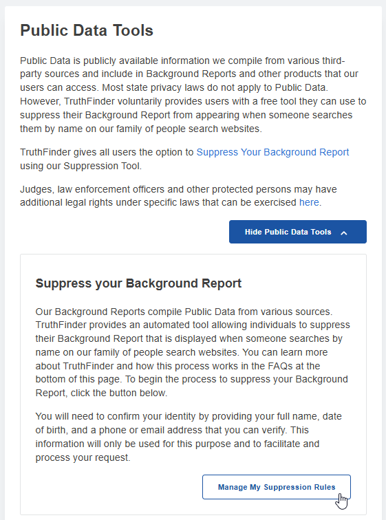 Go to the official suppression page. This page may redirect through PeopleConnect, which manages suppression for multiple popular people search sites. Look for the button labeled “Manage My Suppression Rules.” Avoid screenshots with visible data; blur sensitive fields before saving anything to protect your personal info.