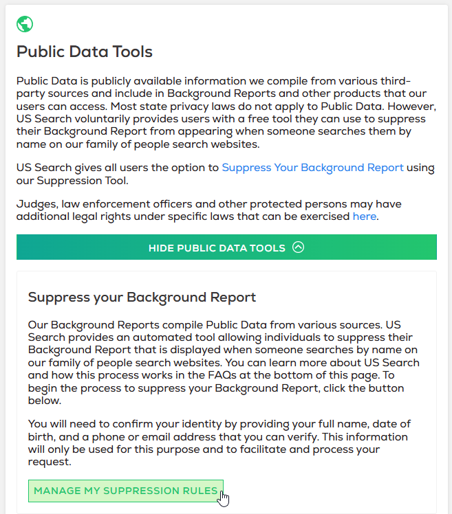 US Search is a people directory service in the PeopleConnect family. The tool collects user data and manages the display of background reports on affiliated sites. US Search compiles data from public records and commercial sources.