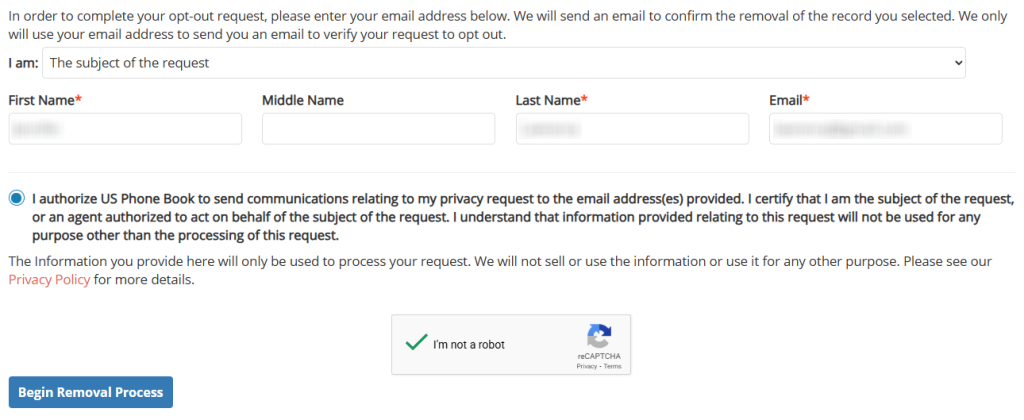Fill in the required fields, including your email address (enter your email exactly as you can access it). Add any requested identifiers, such as a phone number or listing link. Complete CAPTCHA verification. Click the button labeled “Begin Removal Request.” Tip: If CAPTCHA loops, switch devices or browsers.