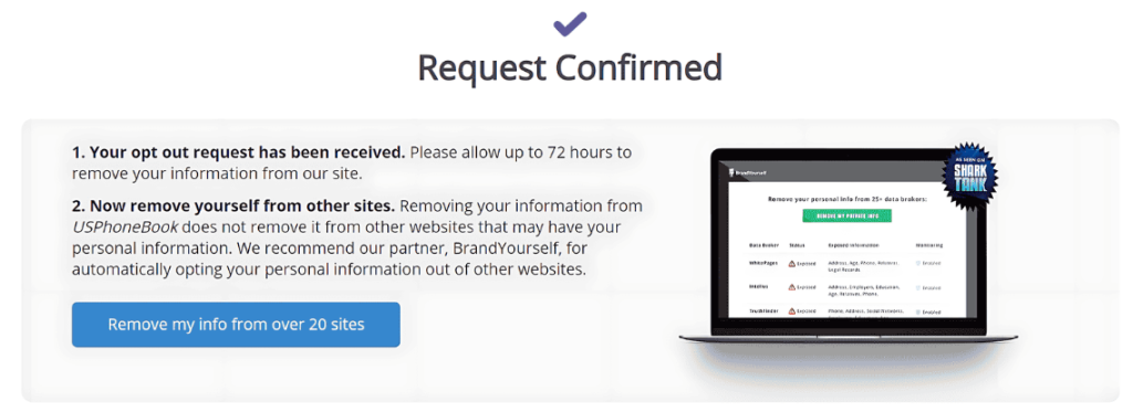 Track your request using the confirmation email. Many guides note that USPhoneBook removes listings after verification, but people search sites can refresh. Tip: Set a reminder to re-check.