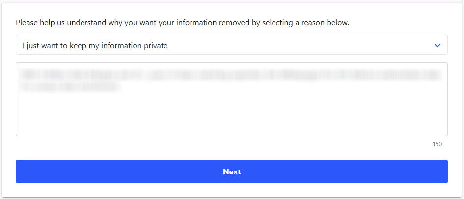 After you submit the profile link, confirm the Whitepages listing is yours and start the removal process. Pick a reason from the dropdown. If you want to remove your information from Whitepages because details are incorrect or you just want to protect your privacy, keep your note short.