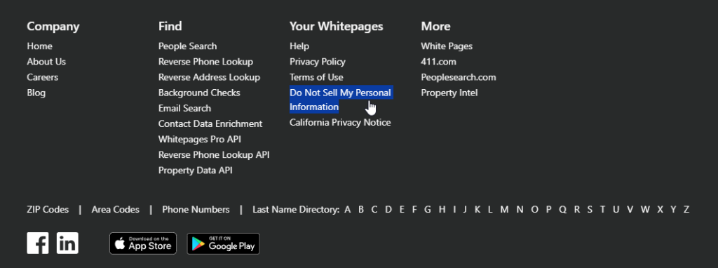 | Opt-out Methods | Whitepages opt-out form/email/mail |