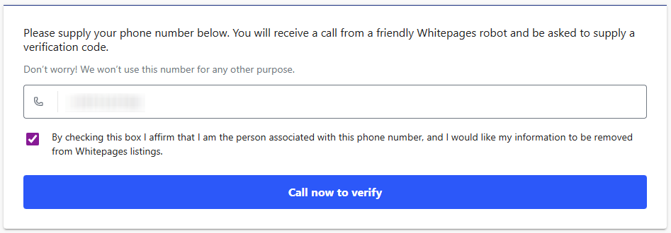 The form will ask you to enter your phone number. You’ll be prompted to enter the code shown on-screen. If the call doesn’t arrive, wait a few minutes and try again. When the call succeeds, complete the Whitepages flow on-screen.